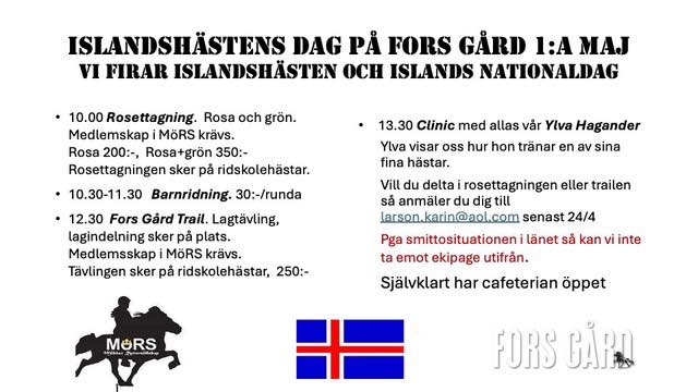 Den 1 maj firar vi Islandshästens dag på Fors Gård, välkomna att fira med oss! Läs schemat för dagen här nedan: