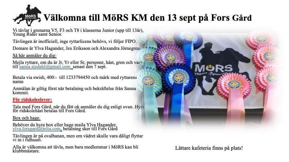 Varmt välkomna till MöRS KM på Fors Gård den 13/9! Nedan finner ni ryttarbrev och startlistor(uppdaterade) inför helgens tävling, klicka på bilderna för att se dem i större format. Stort lycka till alla tävlande!